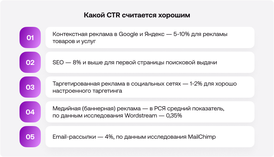 Метрика используется для сравнения каналов и форматов между собой — например, CTR поисковой рекламы и рекламы в социальных сетях. Так определяют наиболее эффективные способы продвижения.
