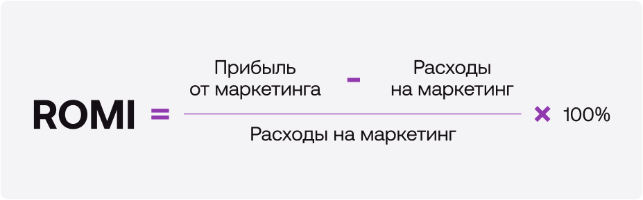 Магазин вложил 50 000 рублей в рекламу ВК и получил 150 000 рублей: ROMI — 200%. Та же сумма, вложенная в наружную рекламу, принесла лишь 75 000 рублей: значит, ROMI — 50%.