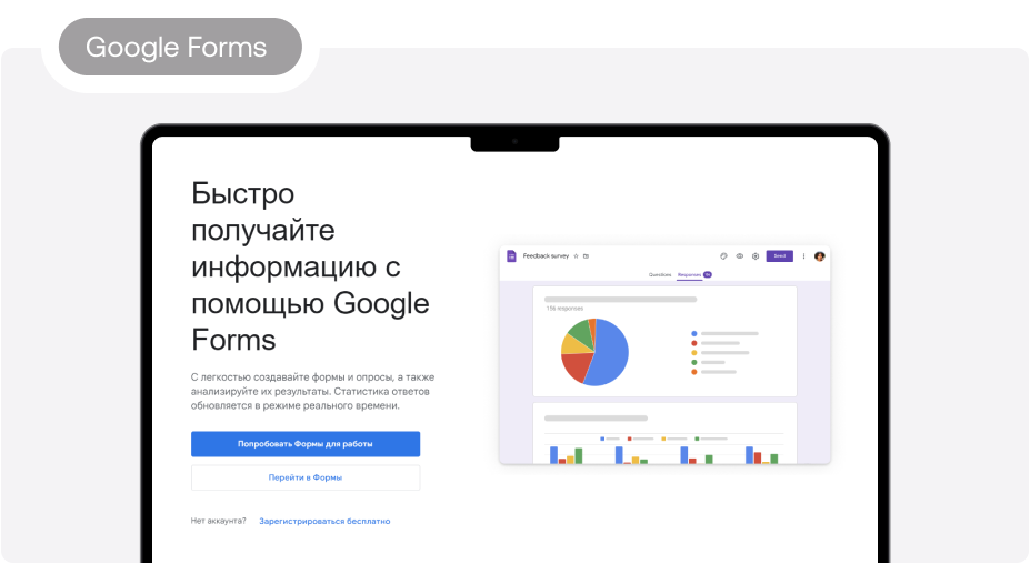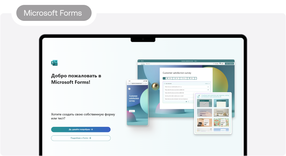 Продукт от Microsoft подходит для создания опросов и тестов. Отправить анкету можно по почте или с помощью ссылки. Форму удобно просматривать через любой браузер — как на десктопе, так и с мобильного устройства. Доступ к собранным ответам возможен в режиме реального времени. MS Forms позволяют создавать опросы со сложной логикой, где следующий вопрос зависит от ответа на предыдущий.